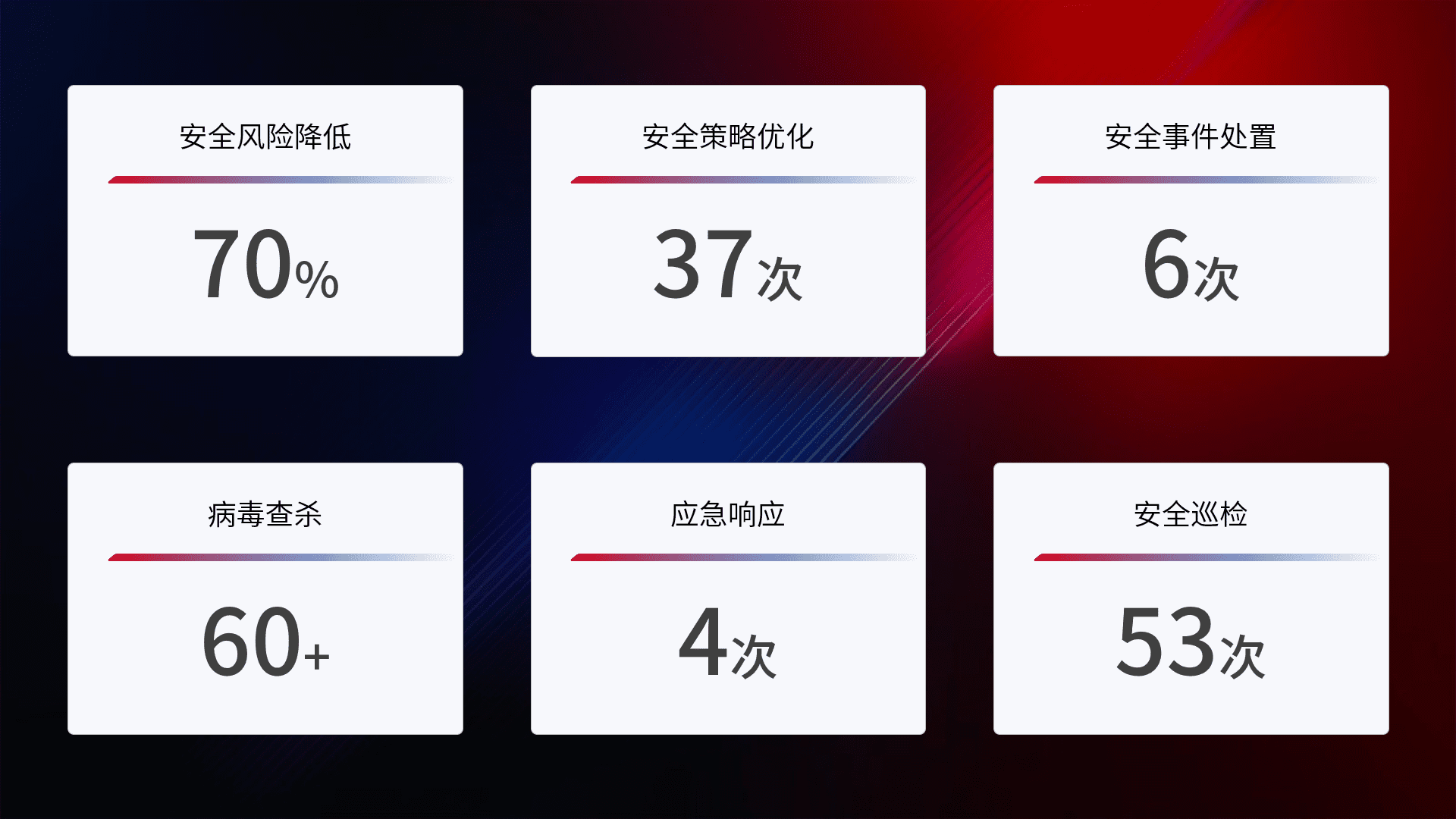 提供全面的安全事件报告体系,,,包括处置报告、、、、周报、、季度和年度总结,,,,结合持续监控,,帮助客户深入了解网络安全状况。。